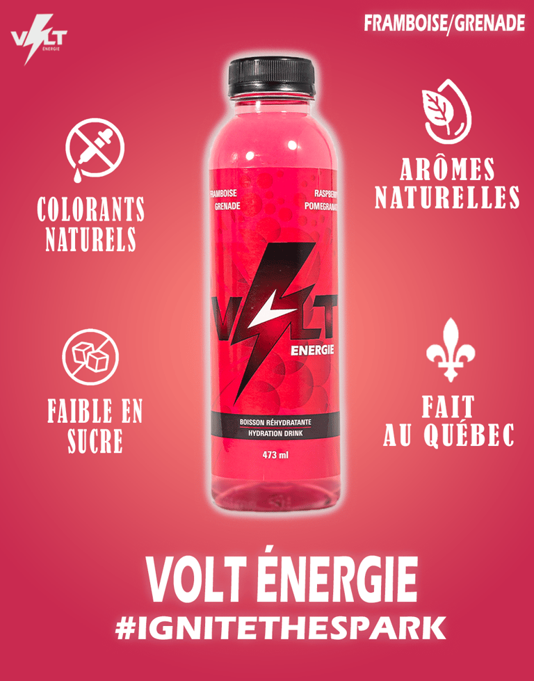 Éclatante et rafraîchissante, la saveur Framboise Pomme Grenade de Volt Énergie combine la douceur acidulée de la framboise, la fraîcheur croquante de la pomme et l’intensité exotique de la grenade.